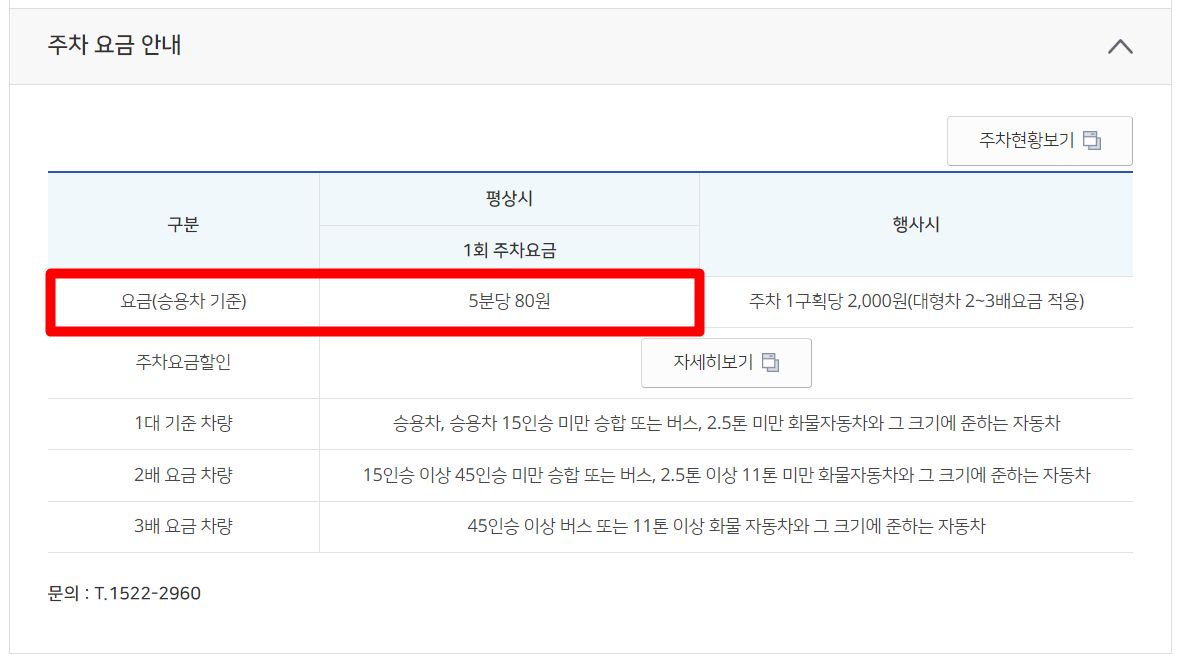승용차 기준으로 평상시 1회 주차요금은 5분당 80원으로 규정되어있습니다.