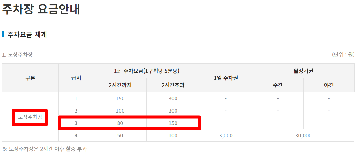 노상 3 급지 주차장은 2시간까지는 5분당 80원으로 적용되며 주차시간이 2시간을 초과하게 되면 5분당 150원으로 2배 가까이 요금이 할증됩니다.